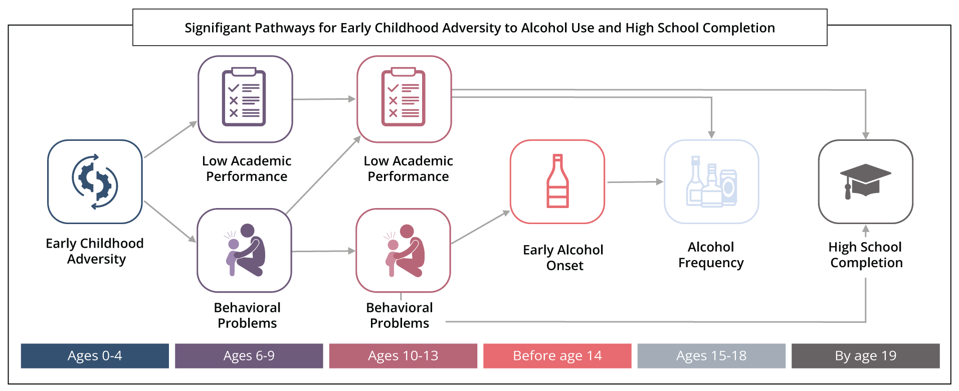 Exposure to adverse conditions early in life can affect a young child’s neural, cognitive, and emotional development. Extensive research has established a strong association between childhood adversity before age eighteen and substance use in adolescence and adulthood. However, little attention has been placed on early life adversity and the mechanisms linking this with outcomes many years later.