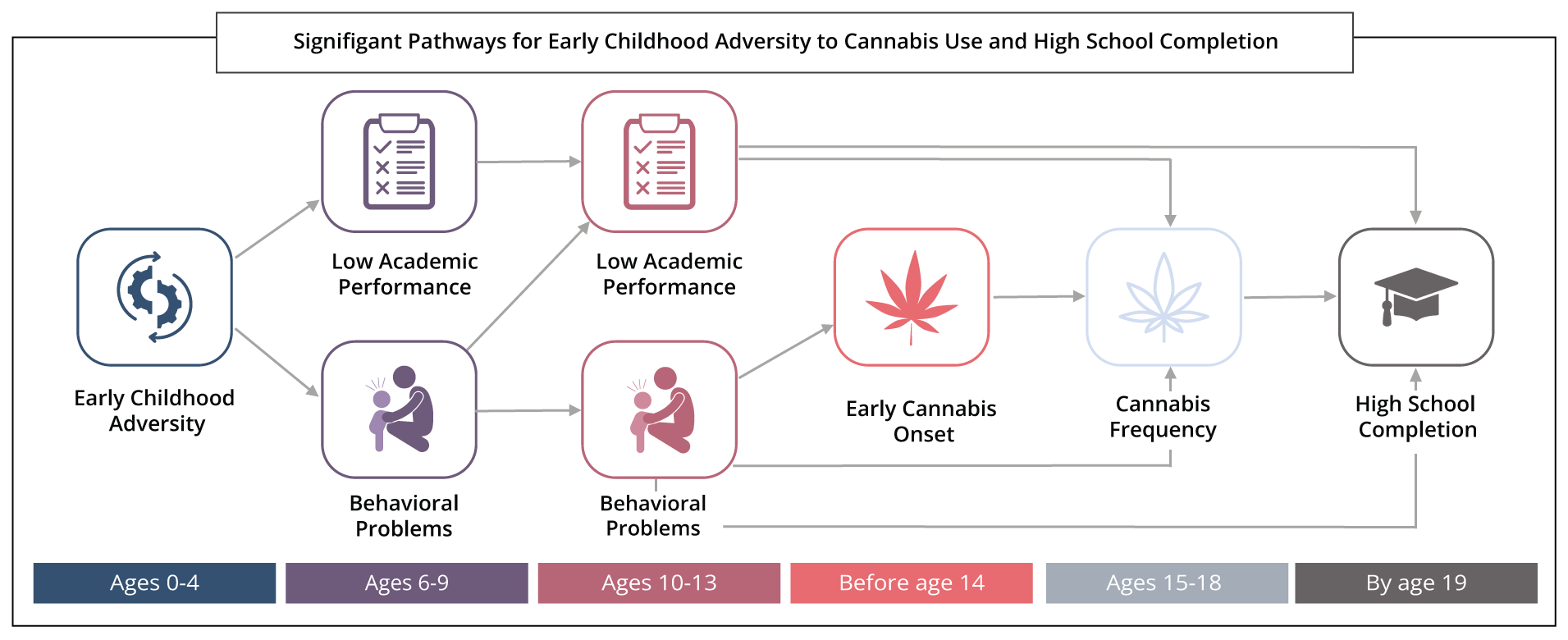 In other findings, ECA also had more immediate impacts on academic problems in childhood. However, it was ECA’s effect on behavioral issues which increased adolescent cannabis use and lowered high school completion by age 19. Moreover, a direct path linking ECA and lowered high school completion remained, suggesting other factors not captured in this study are relevant.