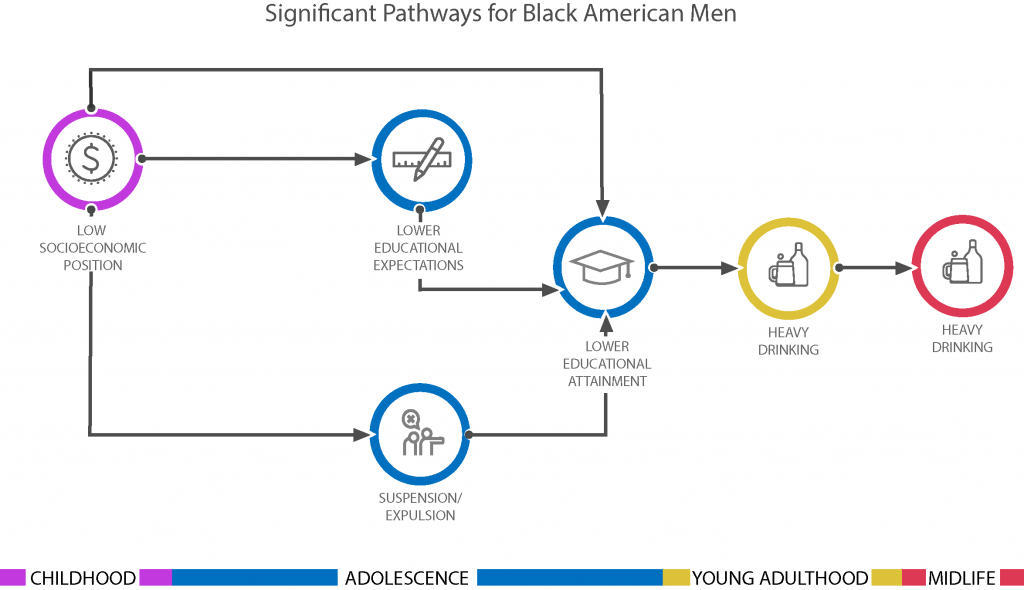For Black men, adverse socioeconomic position in childhood led to lower educational expectations, higher rates of suspension, and lower educational attainment, resulting in higher rates of heavy drinking in young adulthood that continued into midlife.