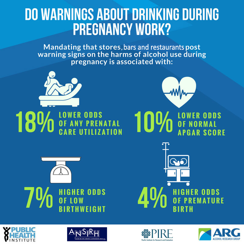 Subbaraman, M.S. Thomas, S., Treffers, R., Delucchi, K., Kerr, W.C., Martinez, P., Roberts, S.C.M. (June 2018). Associations between state-level policies regarding alcohol use among pregnant women, adverse birth outcomes, and prenatal care utilization: Results from 1972-2013 Vital Statistics. Alcoholism: Clinical and Experimental Research: https://onlinelibrary.wiley.com/doi/abs/10.1111/acer.13804