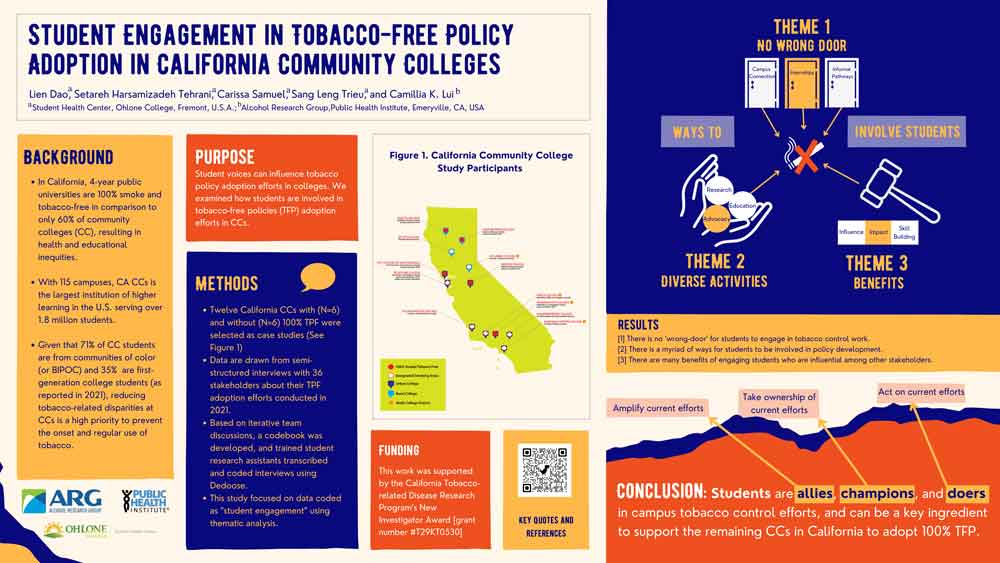 The project presented at two conferences in 2022. The first study presented at the Society for Public Health Education’s annual conference and examined student engagement in tobacco-free policy adoption at community colleges in California. Data from interviews with 36 stakeholders representing six colleges with and six college without a tobacco-free policy were analyzed and coded to identify the theme of student engagement. Findings showed that there was no ‘wrong-door” approach when engaging students in the process. Connections to campus, internships and informal pathways were the primary ‘doors’ to build student engagement. There were also a myriad ways for students to be involved in the policy process including in the areas of research, advocacy and education. The study also found that student engagement benefits both the students (skill-building) and the process, in particular if the students are influential with other stakeholders—they can amplify, own, and act on policy efforts as allies, champions and doers.