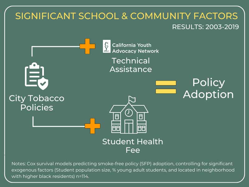 READ: Lui, C.K., Mulia, N., Ye, Y., Patterson, D., Trieu, S.L. (2022) School and community factors associated with the adoption of 100% smoke-free policy by California community colleges, 2003-2019. American Journal of Health Promotion.