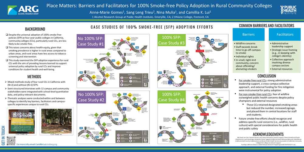 In California, only 52 of the 114 community college campuses are smoke-free or tobacco-free—a stark contrast to California’s four-year public colleges which are all tobacco-free. In response to this disparity, an ARG research team, led by Scientist Camillia K. Lui, conducted a mixed-method study that examined both campus and community influences on smoke-free policy adoption at community colleges. The team analyzed tobacco control policy databases, school administrative records, survey data, Census and other data, along with 36 interviews with stakeholders representing 2 community colleges, and site visits. Study findings pointed to influential factors that may be intervened upon and successful strategies that have been used, to facilitate the adoption of smoke-free policy at California community colleges. Results will be used to help the remaining 62 campuses overcome institutional and other barriers to tobacco-free policy adoption and can point to more effective environmental strategies to reduce tobacco-related disparities.